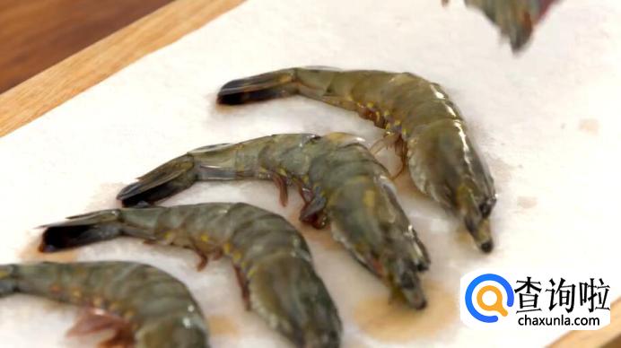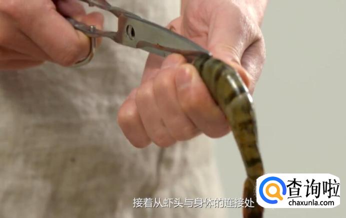首先处理虾。先剪去虾头的须和虾脚,接着从虾头与身体的连接处沿背部剪开虾壳约2厘米。
