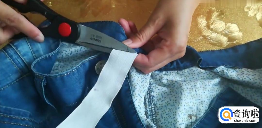 两边都裁好后,找来一块大小合适的松紧布,从拆好的这个口子中穿过。