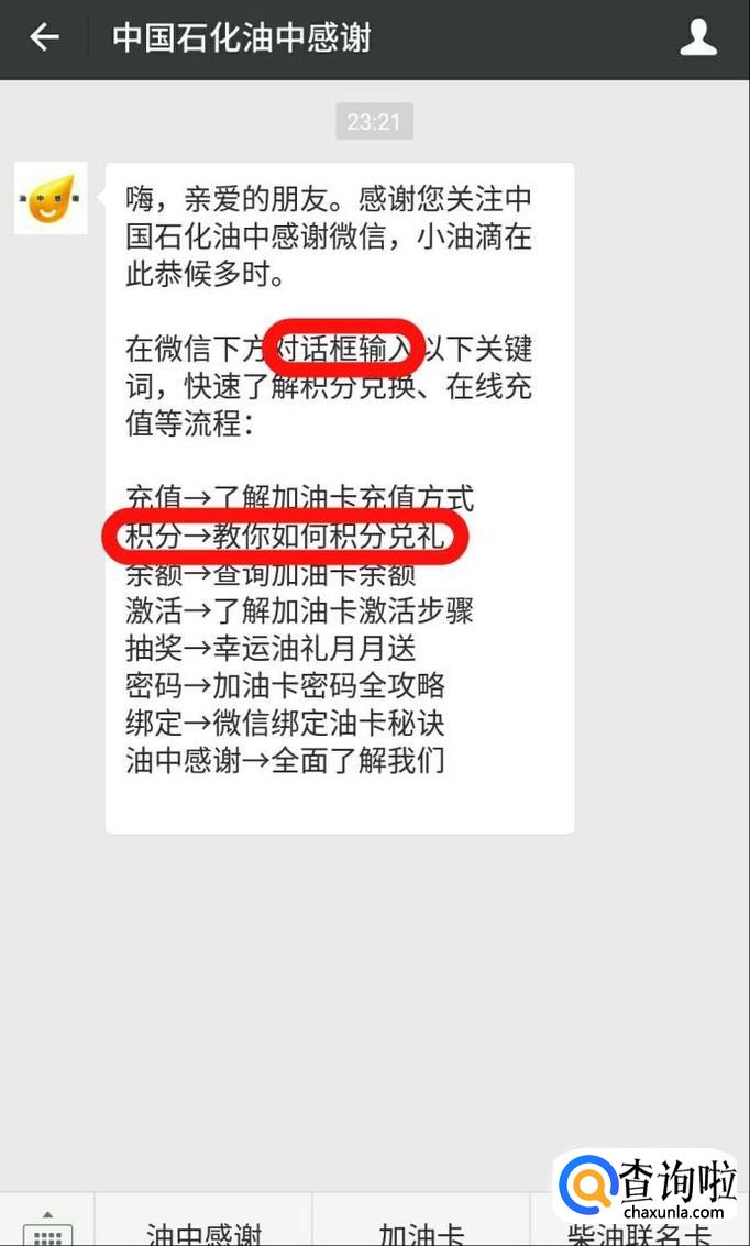 关注“中国石化油中感谢”微信平台,然后在对话框中回复积分,就可以按照步骤进行积分兑换啦。如图所示。