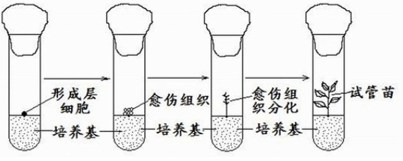 在试管的培养基中有植物生长激素和营养物质。其中,生长激素的作用是主要的,它能促进细胞分裂。植物器官、组织在生长激素的作用下,细胞分裂不断进行,结果就形成一种不规则的细胞团块,科学家称它为愈伤组织。这些愈伤组织在含有细胞分裂素和培养基的培养液中培养,就能诱导出完整的植株。