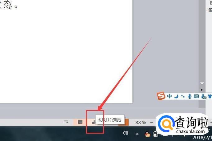 在PPT软件操作页面右下方,可以看到幻灯片显示模式,这里我们选择“幻灯片浏览”按钮。