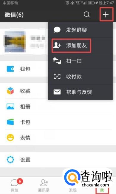 之后我们点击我,然后我们点击右上角的添加按钮,弹出的界面,我们点击添加朋友;