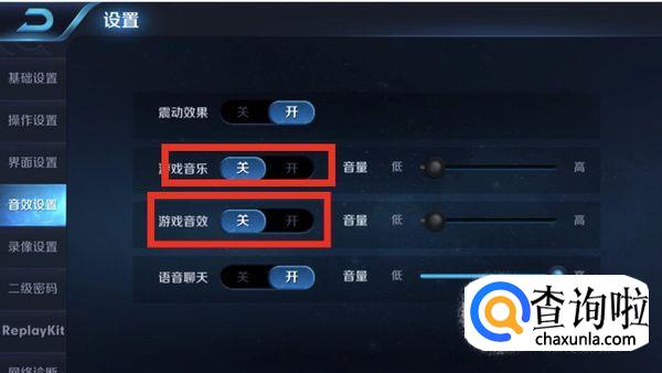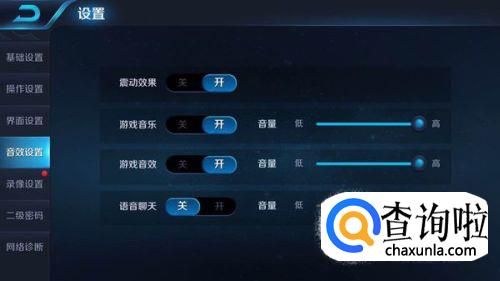 在设置中找到音效设置,在看到游戏音效的两个设定。游戏音乐是王者荣耀自带的游戏音乐,游戏音效是指打斗时发出的声音。