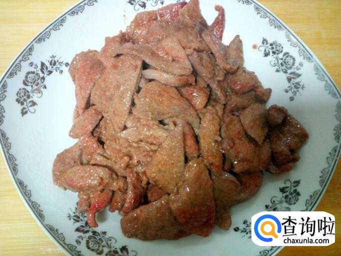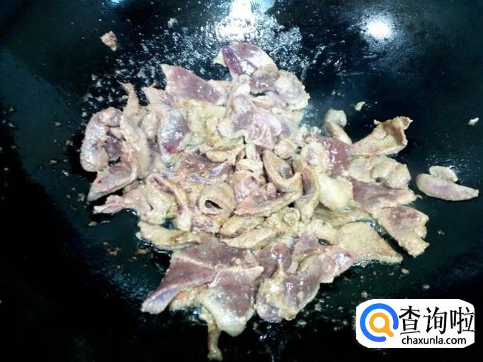 锅里放入油加热,油六,七成热时,放入腌制好的猪肝翻炒,炒至猪肝变色,表面坚挺,盛出备用。