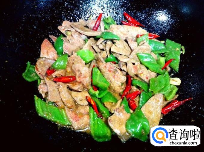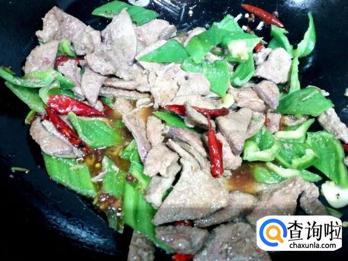 炒至青椒断生,放入炒好的猪肝,稍翻炒一下,随即放入调和好的料汁。
