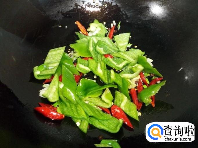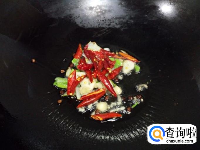锅里重新放入油加热,油热后放入花椒,葱,姜,蒜,红干椒爆锅,随即放入青椒翻炒。