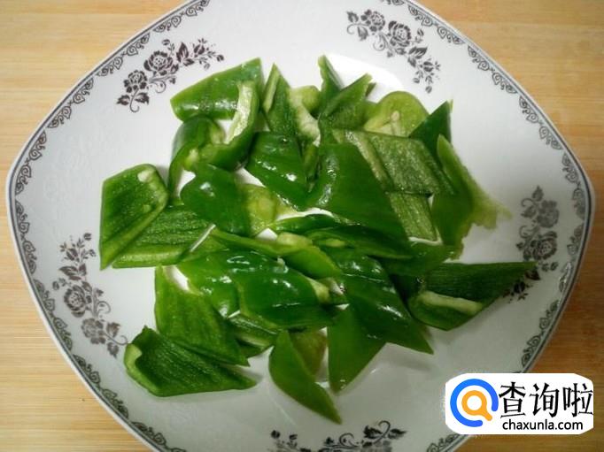 青椒用水清洗干净,控干水分,切成片。