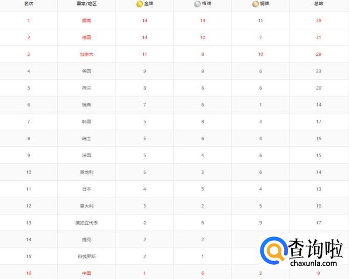 本届冬奥会上,我国在参加国家中排行第十六名,第一名是挪威,14枚金牌。
