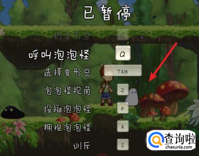 除了小男孩的动作,还有操作泡泡怪的动作,比如Q是呼叫泡泡怪,TAB选择变形豆,E投掷泡泡怪,A拥抱泡泡怪等。