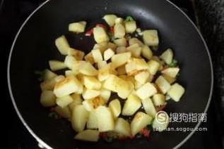 起锅烧油,锅热后先倒入辣椒段,再倒入土豆翻炒,土豆翻炒大约一分钟。