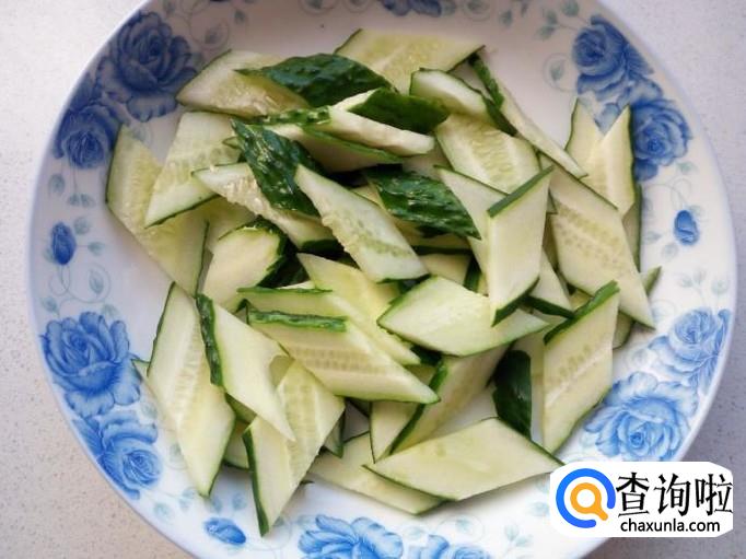 黄瓜用水清洗干净,控干水分,切成0.3公分左右厚的片。