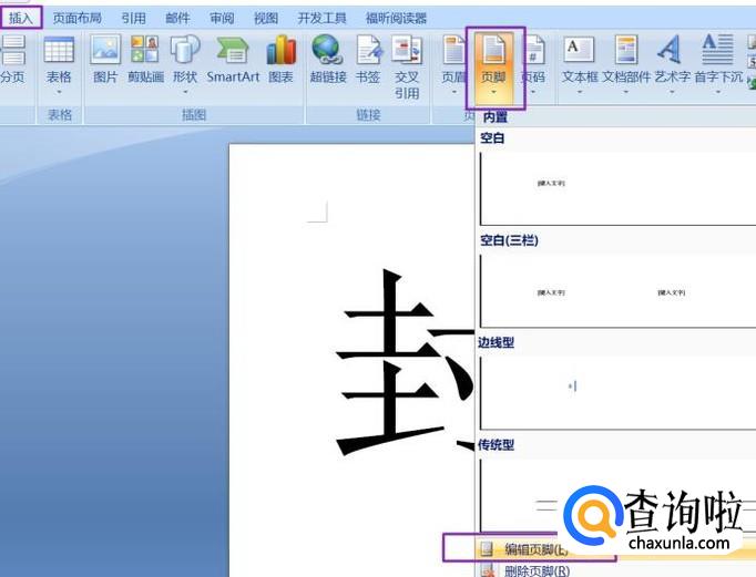 点击工具栏中的插入,点击页脚的下拉箭头,然后点击编辑页脚;