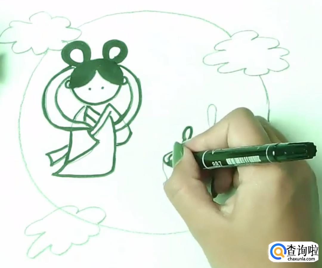 接下来在嫦娥的头部下面画出嫦娥的身体,注意画出嫦娥仙子飘逸的仙女裙。