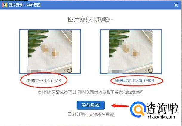 点击之后就会出现这样的一个图片正在瘦身中的提示,瘦身之后我们可以看到两张图片内存大小的一个对比,一个是原先的12.6M,压缩后是846.60KB。选择保存副本,原图不会动,多一张压缩后的图片。