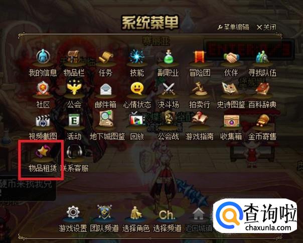 在系统菜单中,点击“物品租赁”选项,由于个人游戏分辨率和画面比例设置的不同,选项的位置会有所出入。
