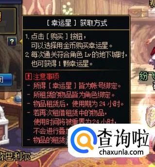 【幸运星】可以在物品租赁栏中,消耗金币进行购买;每次通关符合角色等级的地下城时,也可以获得1颗幸运星。