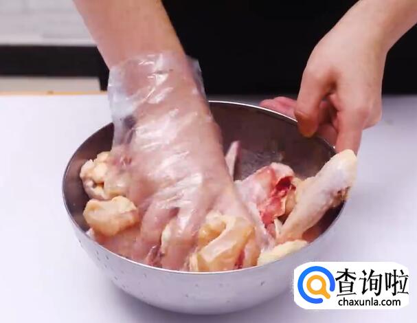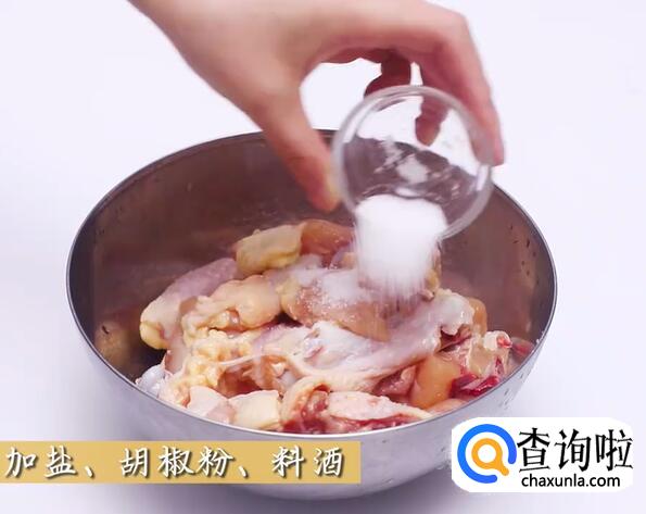 把鸡肉切块,放入碗中,加入适量盐、胡椒粉、料酒。