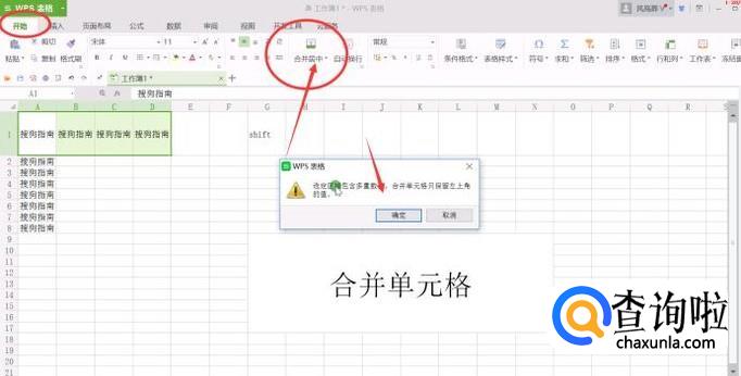 第一种快捷方法,我们在开始菜单栏下的合并单元格快捷功能单击,确认