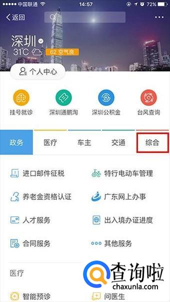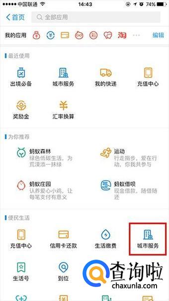 登陆支付宝,在首页面搜索”城市服务“,进入下一个步骤。