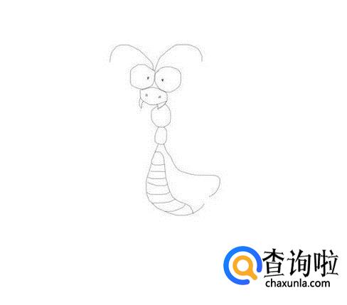在头部的下面再画出螳螂的身体,然后在身体上画出螳螂的肚子,如图所示: