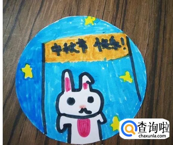 用水笔在一张圆纸片上画出兔子,写上“中秋节快乐”。当然,你也可以按照自己的想法随意创作。