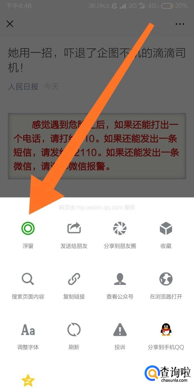 弹出菜单后,再点击“浮窗”选项即可开启浮窗功能。