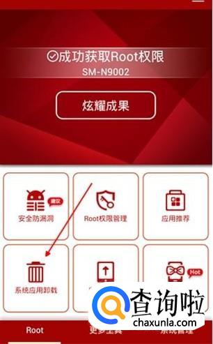 获取权限成功后,在一键root应用界面找到系统应用卸载