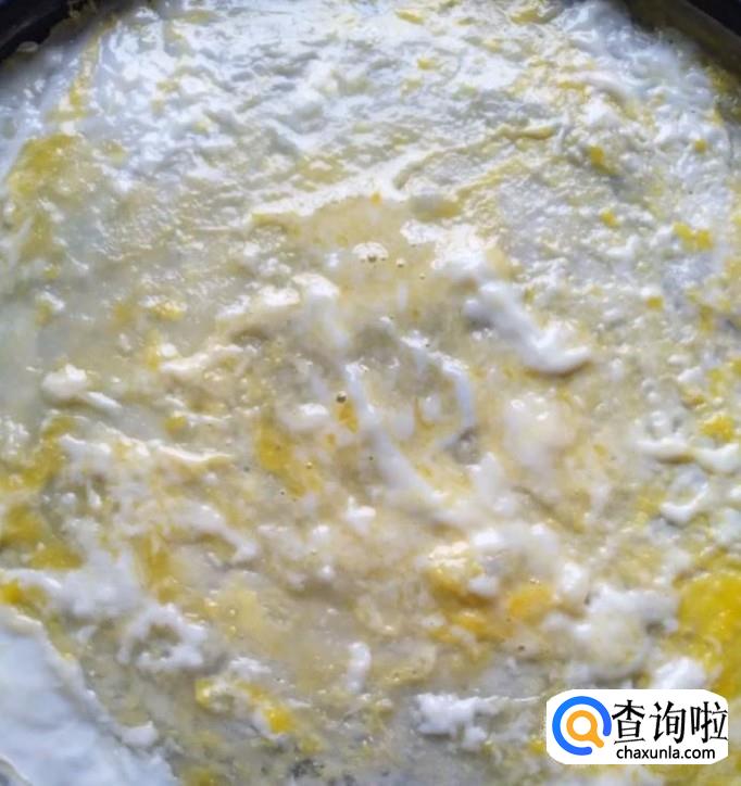 接着我们在电饼铛中倒入一勺面糊,用刮板摊平,打入一个鸡蛋,摊平,定型以后翻面