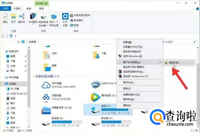 首先在电脑的相应磁盘里点击“授予访问权限”。