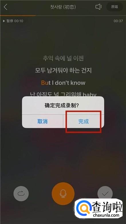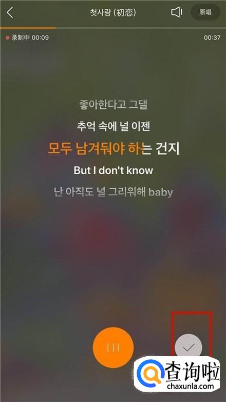 等到歌曲演唱完成,点击屏幕右下方的“√”,如下图所示。
