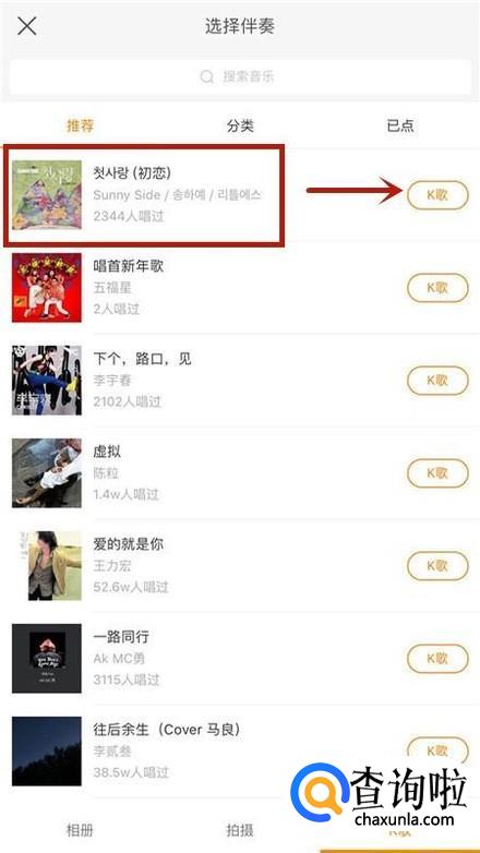 然后选择一个我们想唱的歌曲并点击右侧的k歌,如下图所刺。