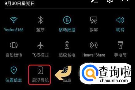 最为快捷的开启方法就是在手机屏幕上方拖动通知栏,然后即可在最上方的常用功能列表中看到“悬浮按钮/悬浮导航”了,如下图;
