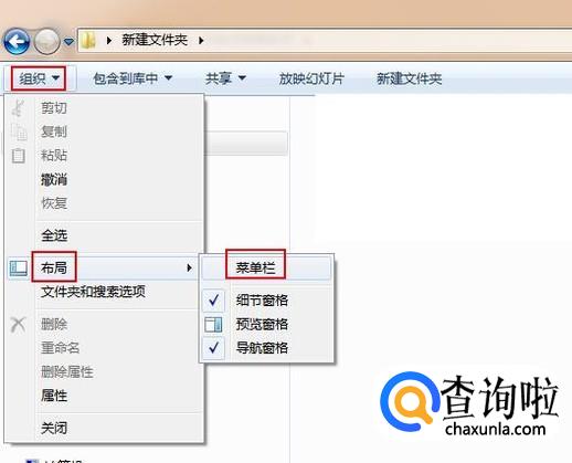 打开任意一个文件夹,在其左上角点击依次“组织”-“布局”-“菜单栏”选项。