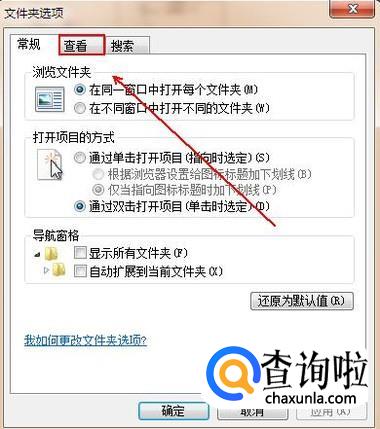 在“文件夹选项”窗口中单击“查看”选项。
