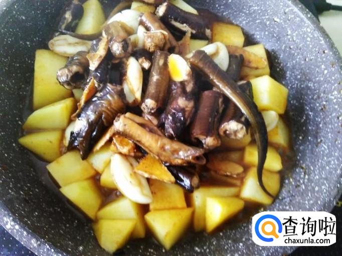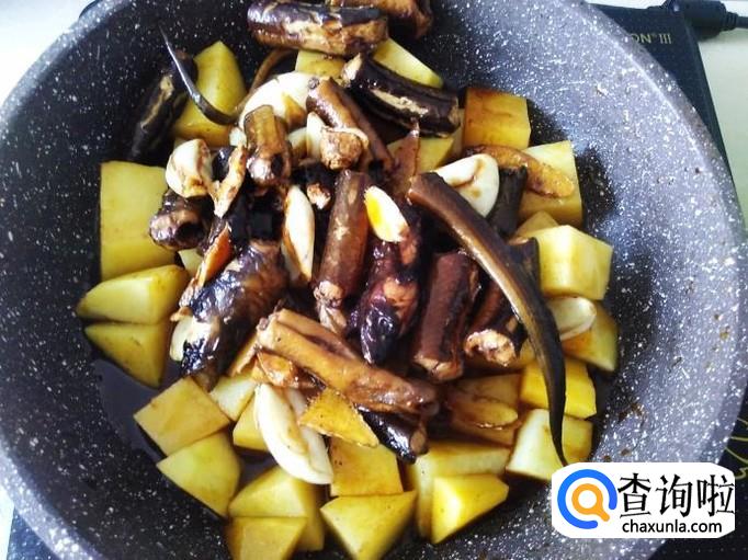 黄鳝回锅,铺在土豆面上,盖上盖子用小火焗。