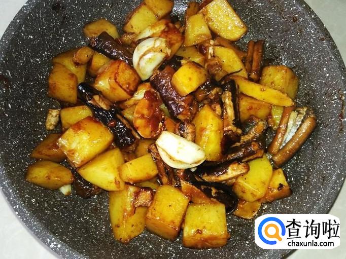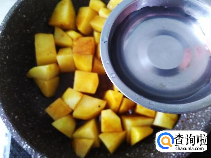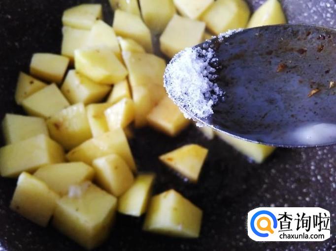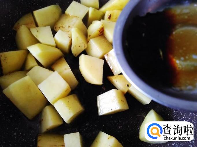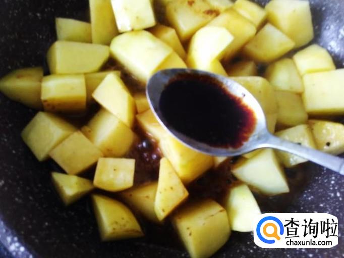 再开火下油,放土豆进去加适量的盐、1勺生抽、1小勺老抽翻炒一下。