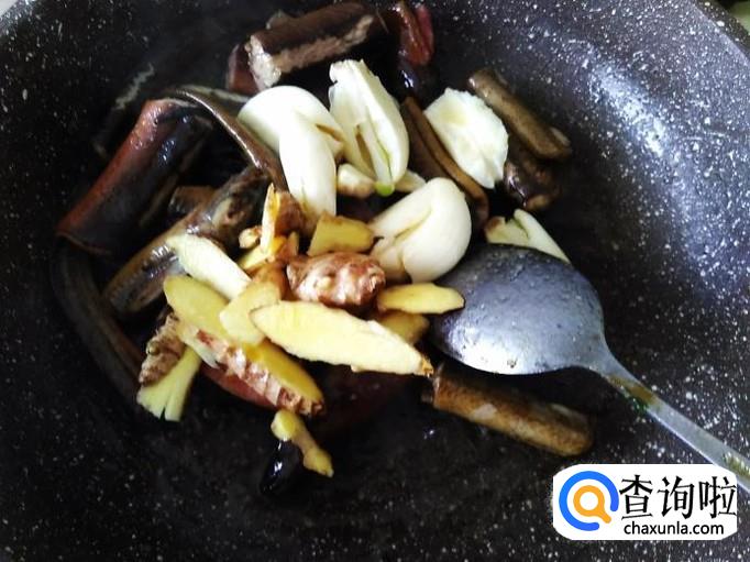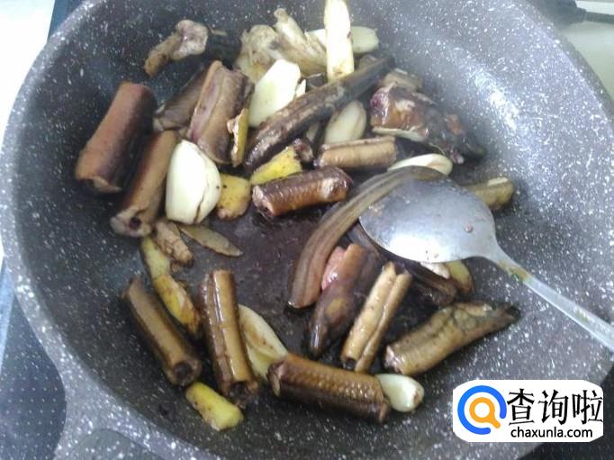 炸煎2分钟左右,下蒜米、姜片进去。
