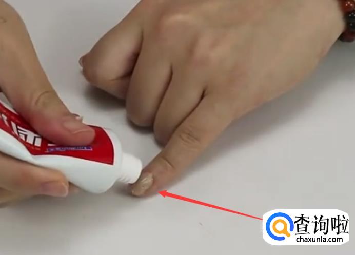 首先我们将牙膏挤到指甲上,如下图所示