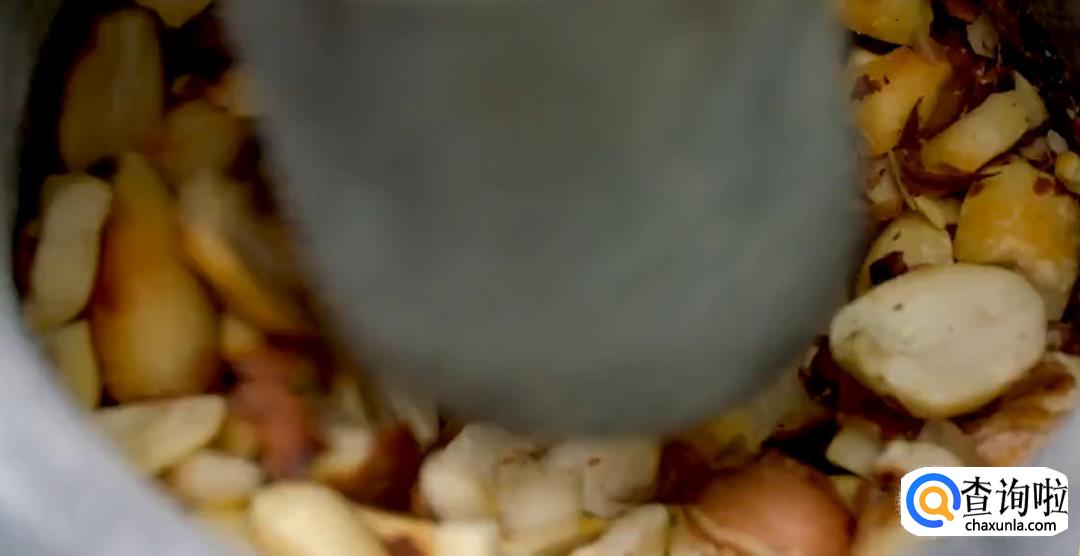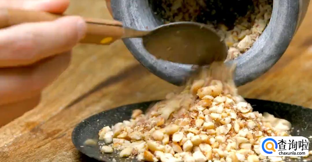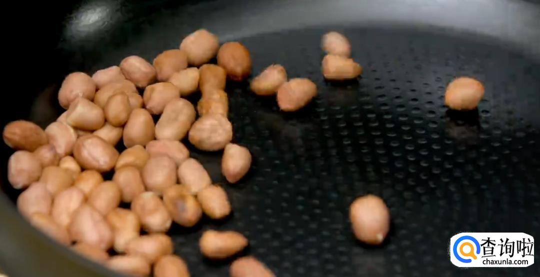 花生米下锅烘熟,然后捣碎。