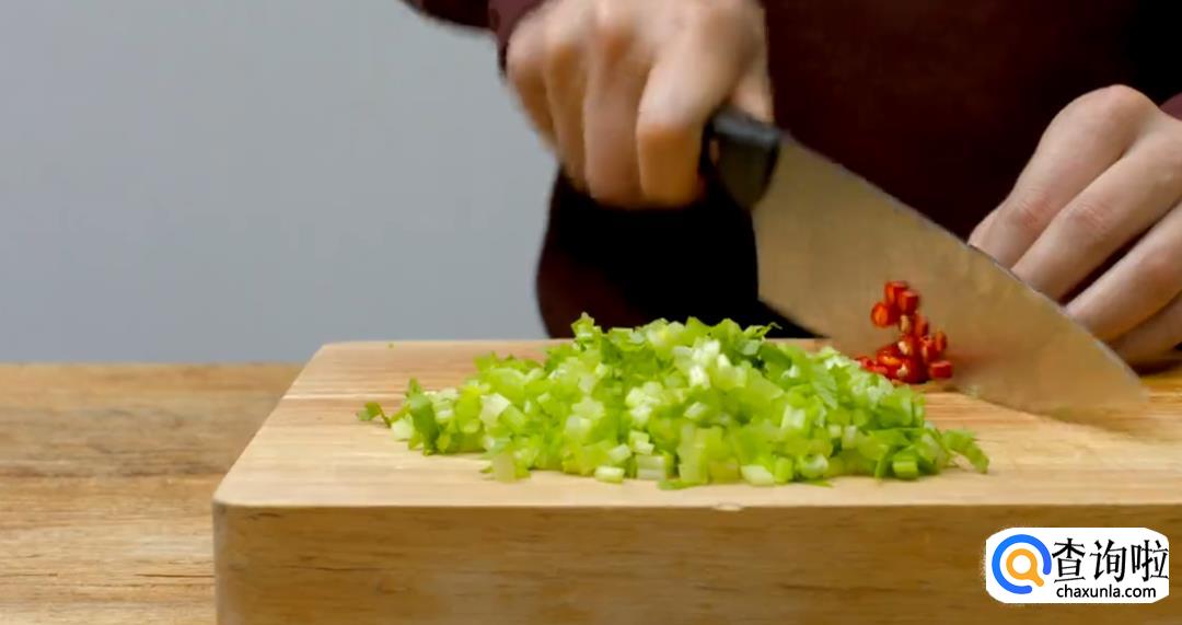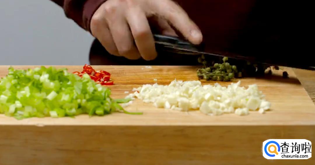 芹菜和小米辣切小段,然后将蒜切碎,再将青花椒拍几下。