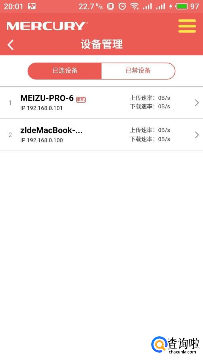 在设备管理中,我们可以查看该WIFI连接中的设备,并且能够对设备进行限速禁止设置。