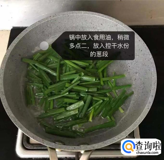 然后锅中放入适量的食用油,待油冒烟,放入控干水分的葱段,如下图所示。
