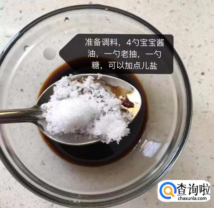 接着在一个碗中加入四勺的酱油、一勺的老抽、一勺的糖和适量的盐,如下图所示。小贴士:如果大家是做给宝宝吃的,可以把酱油用宝宝酱油替代。
