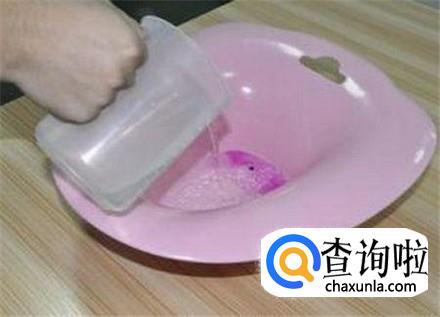 坐浴盆洗干净以后,用干燥的手将一个高锰酸钾药片放入坐浴盆里,再倒入准备好的温开水,等待高锰酸钾药片充分溶解。