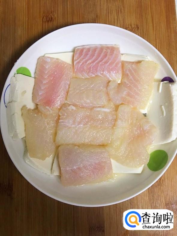 豆腐片均匀地摆放在盘中,然后再把处理好的龙利鱼片摆放在豆腐上。