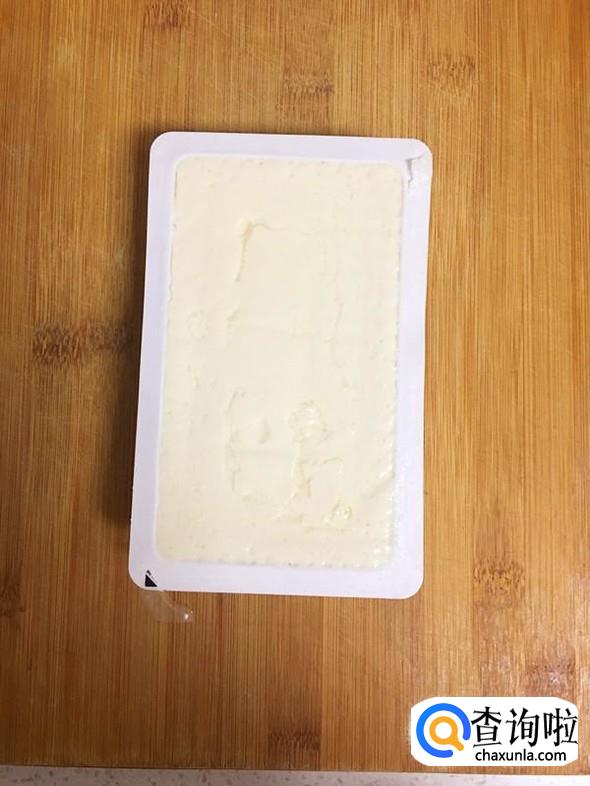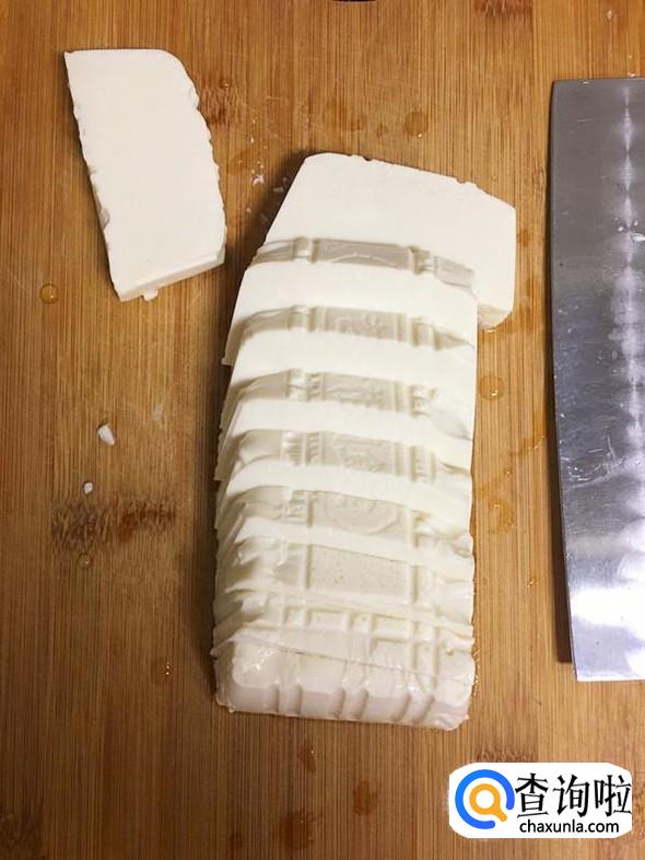 然后把豆腐倒扣在案板上,同样也切成厚片。