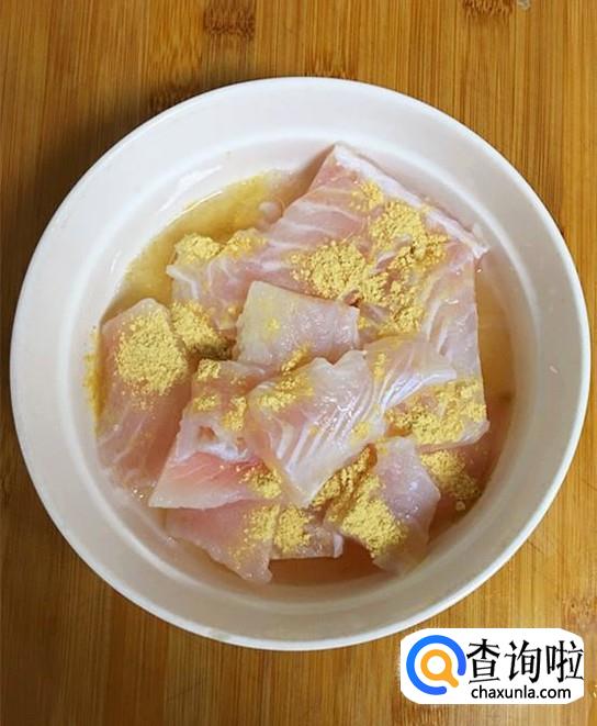 把龙利鱼片放入盘中,依次加入1小勺料酒和生姜粉,拌匀后静置10分钟。