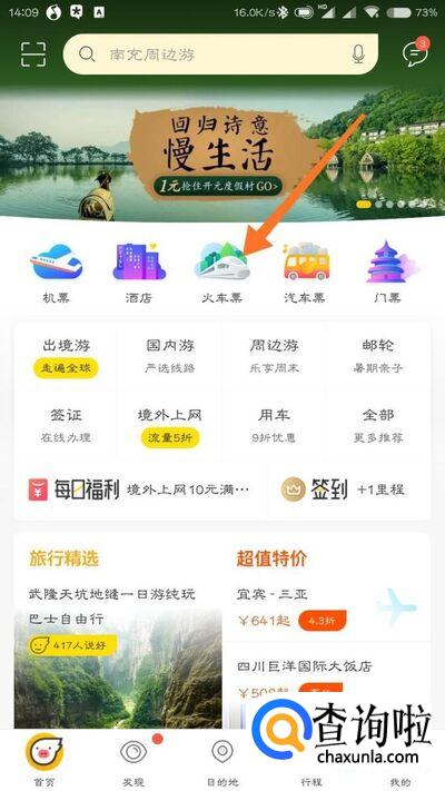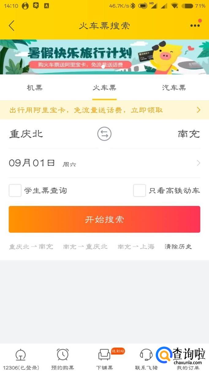 打开飞猪,点击“火车票”,然后输入出发地目的地和出发时间,查询列车班次。