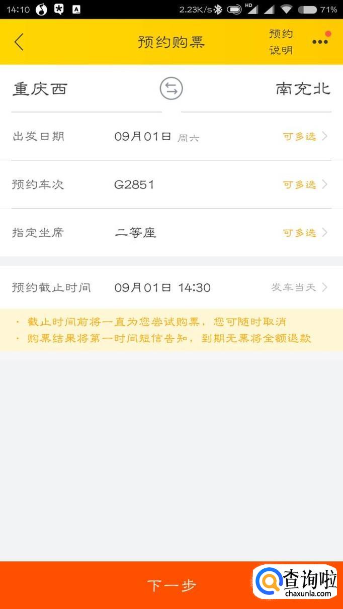 选择座位等级,点击“下一步”。