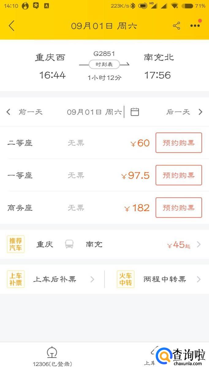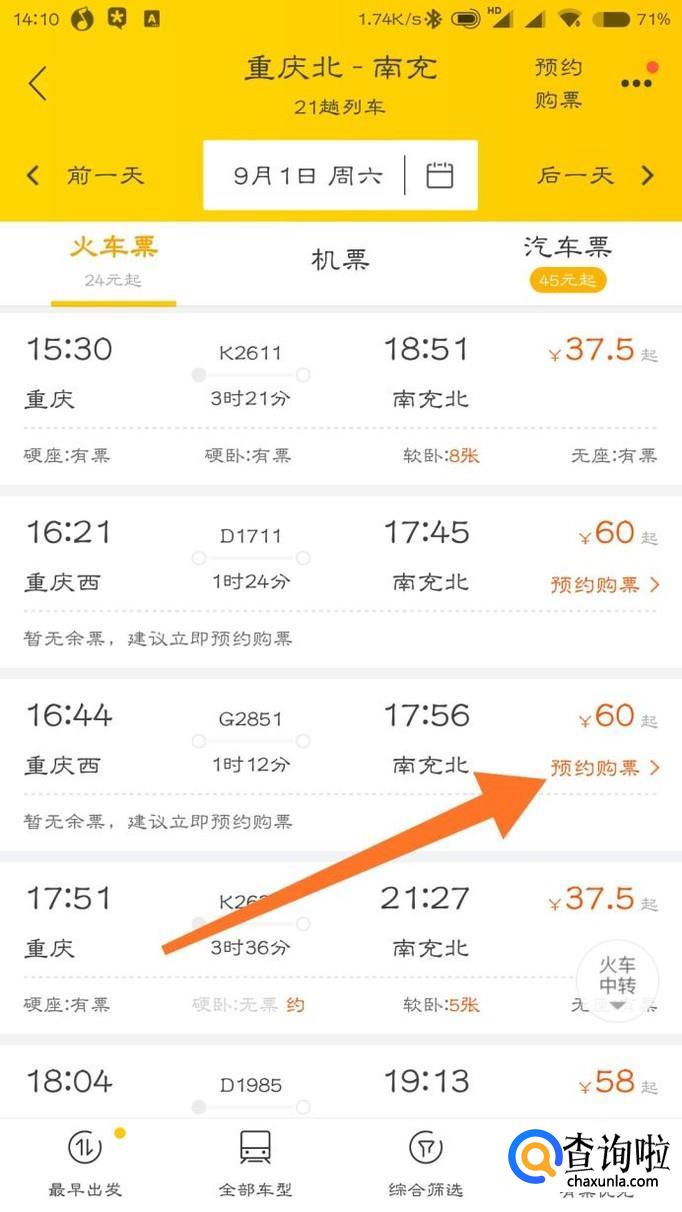如果有箭头所指的“预约购票”就说明这班火车的票已经卖完了,点击“预约购票”。